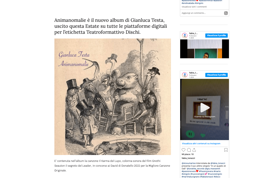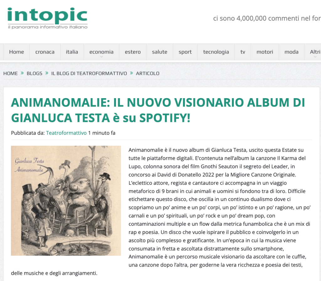 “ANIMANOMALIE è il nuovo album di Gianluca Testa, uscito questa estate su tutte le piattaforme digitali per Teatroformattivo 🎭 Dischi. E’contenuta nell’album la canzone IL KARMA DEL LUPO, colonna sonora del film GNOTHI SEAUTON IL SEGRETO DEL LEADER, in concorso ai David di Donatello 2022 per la Migliore Canzone Originale.