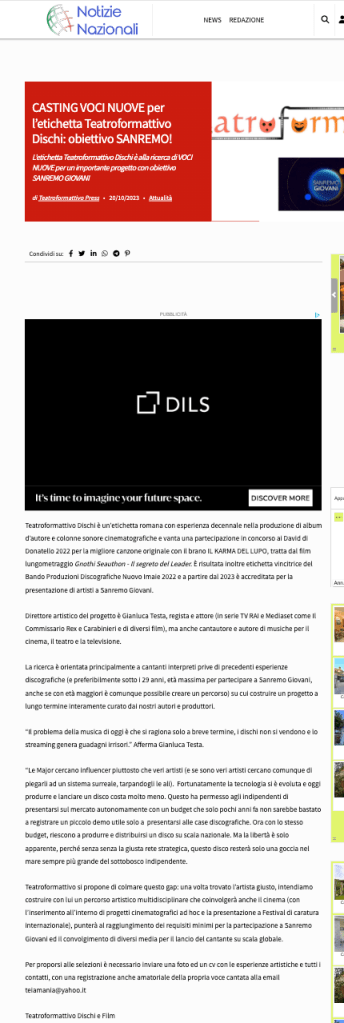Teatroformattivo Dischi, nuova etichetta discografica, cerca in tutta Italia nuove/i giovani cantanti interpreti prive/i di esperienze discografiche precedenti, da provinare per creazione di un progetto originale a lungo termine, interamente curato e sviluppato dallo staff di autori e produttori dell’etichetta discografica di Teatroformattivo e lancio nel mercato della musica, al fine di raggiungere i requisiti necessari per la partecipazione alle selezioni di SANREMO GIOVANI del prossimo anno. I candidati devono essere preferibilmente alla prima esperienza, liberi da contratti discografici e non avere altre incisioni già distribuite sul mercato. L’obiettivo è lanciare un progetto nuovo e promuoverlo preventivamente al fine di raggiungere grandi numeri sulle piattaforme e visibilità, in modo da risultare un progetto serio ed appetibile per la commissione di Sanremo.