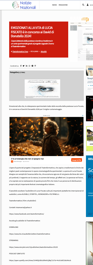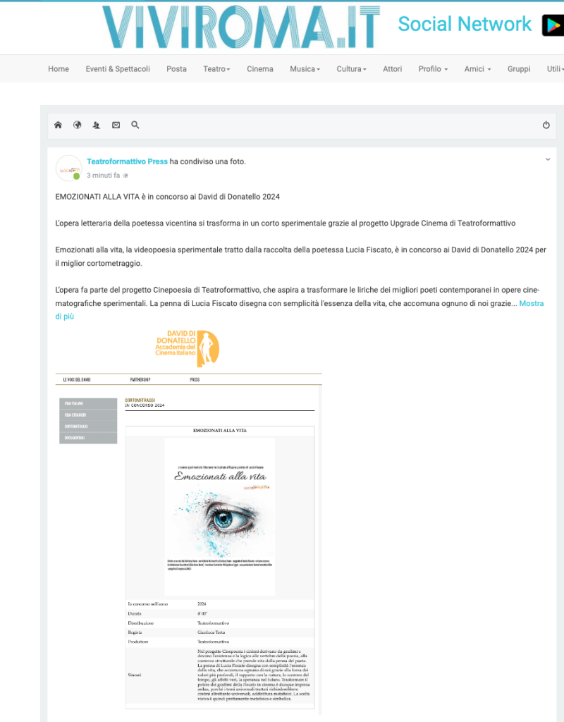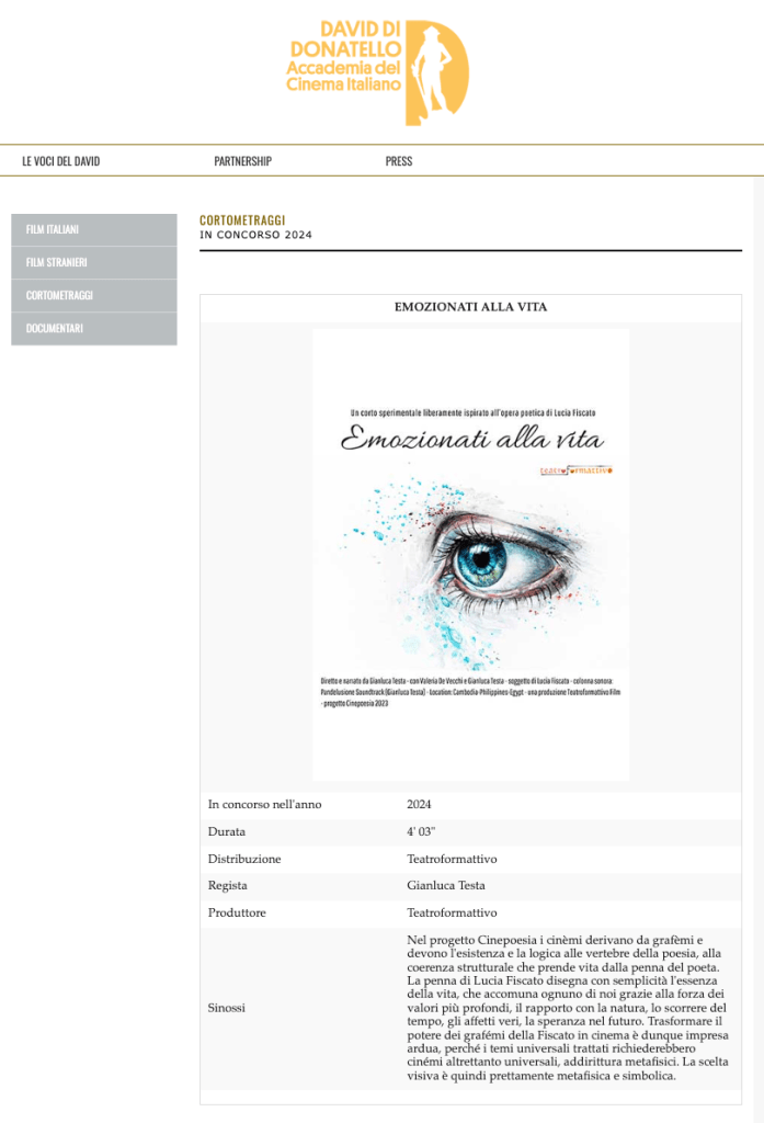 Emozionati alla vita, la videopoesia sperimentale tratto dalla raccolta della poetessa Lucia Fiscato, è in concorso ai David di Donatello 2024 per il miglior cortometraggio.